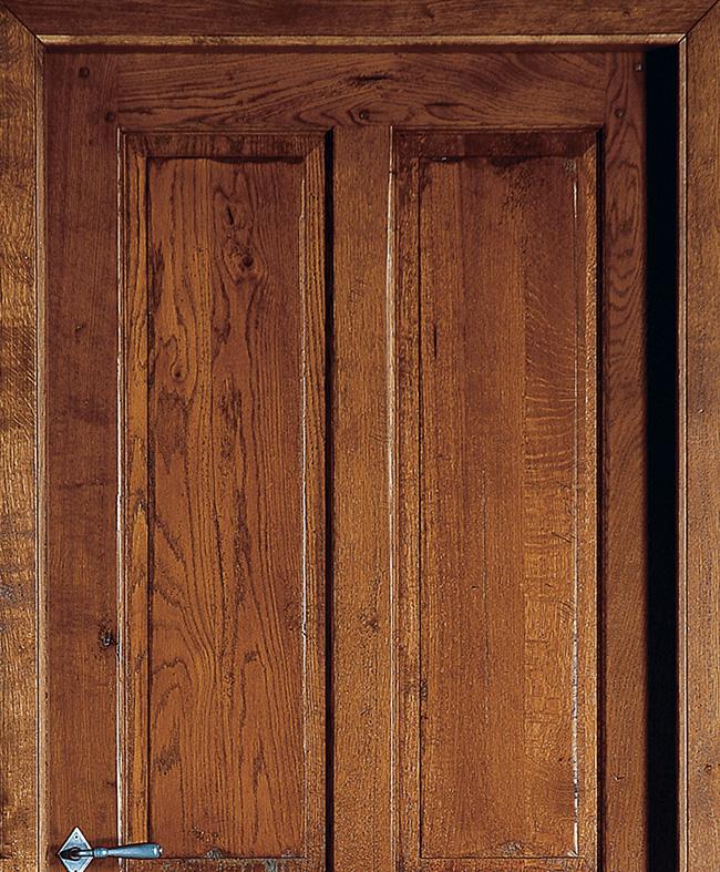 La porte AUBRAC se compose de plusieurs panneaux séparés par un cadre chêne massif. La finition prend en compte les plus infimes détails comme les chevilles en bois.