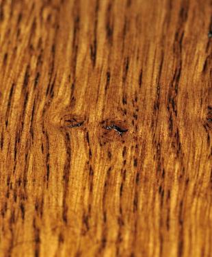 2/ PATTES DE CHAT : Répétition locale de très petits noeuds groupés, au milieu de fibres moirées, comme si un chat avait laissé l'empreinte de ses griffes en passant. Ils sont la trace de rameaux adventifs sur un tronc en pleine lumière.
