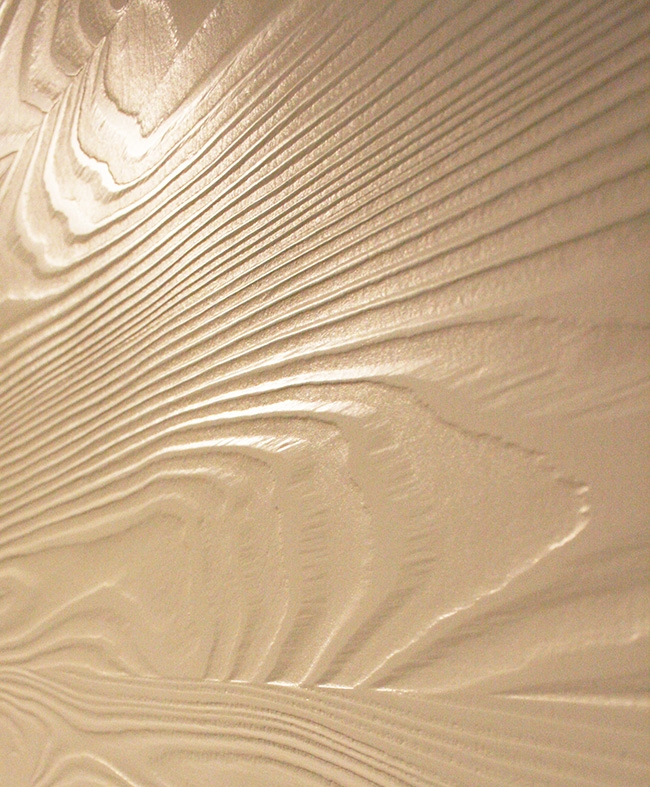 3/ CONTRASTE DE TEINTE : Chaque pièce peut refléter la lumière en des teintes différentes. La surface coupée des fibres affleurantes agissant comme autant de petits miroirs diffractant, on l'observe bien sur les pièces d'une porte qui semblent alternativement sombres ou claires selon la position de la source lumineuse par rapport à l'oeil mais aussi en fonction du sens ou type de bois sur lequel la finition est appliquée.